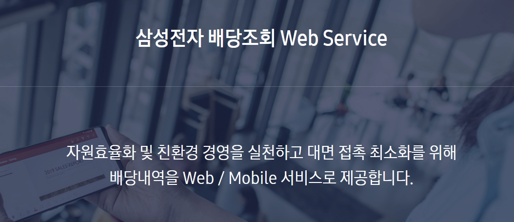 삼성전자 배당조회 Web Service 자원효율화 및 친환경 경영을 실천하고 대면 접촉 최소화를 위해배당내역을 Web / Mobile 서비스로 제공합니다. Web / Mobile 서비스 어디서든 쉽고 간편하게 배당 내역을