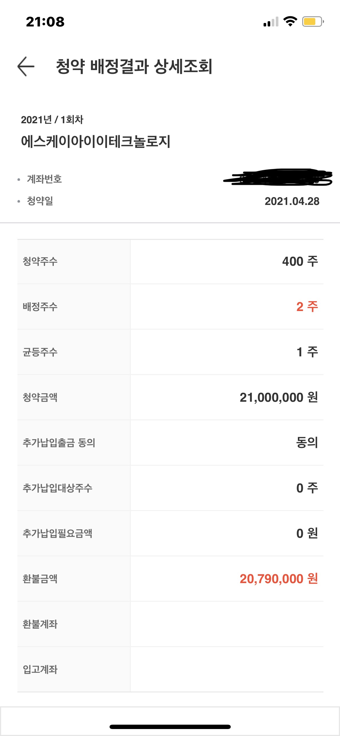 청약한 주식 금액 빼고 나머지가 환불됩니다.