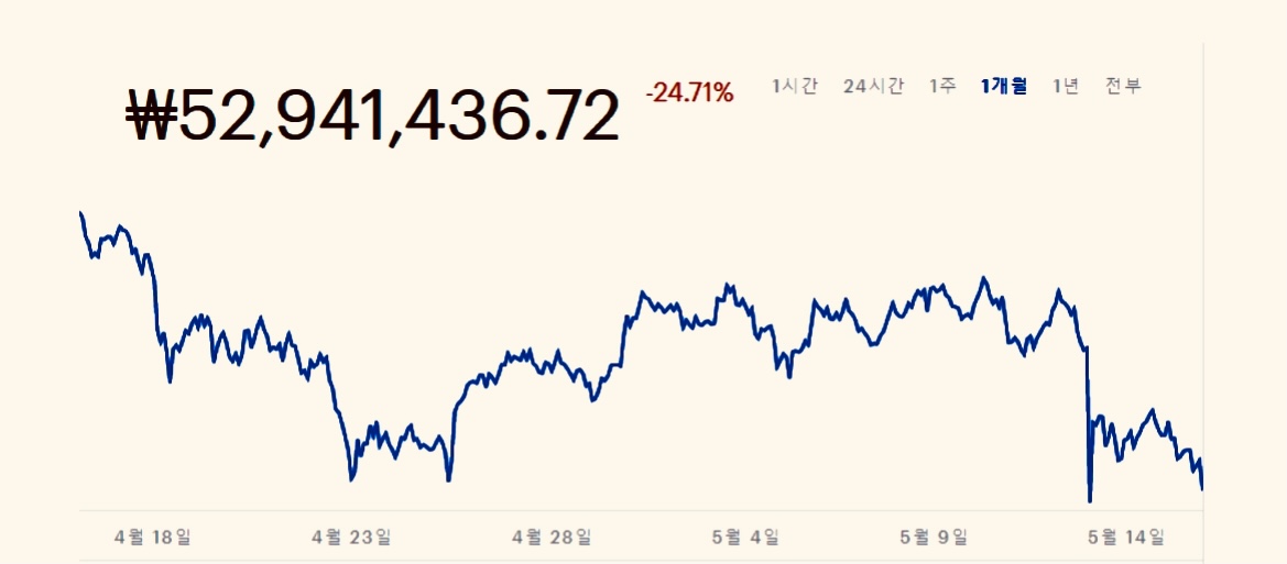 비트코인이 연일 하락하고 있습니다. 1개월 단위로 보면 -24% 가까이 하락했습니다.