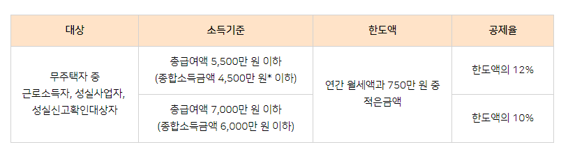 지급하는 월세액(750만 원 한도)의 10%(12%)에 해당하는 금액을 해당 과세기간의 종합소득산출세액에서 공제한다.’고 명시되어 있습니다.