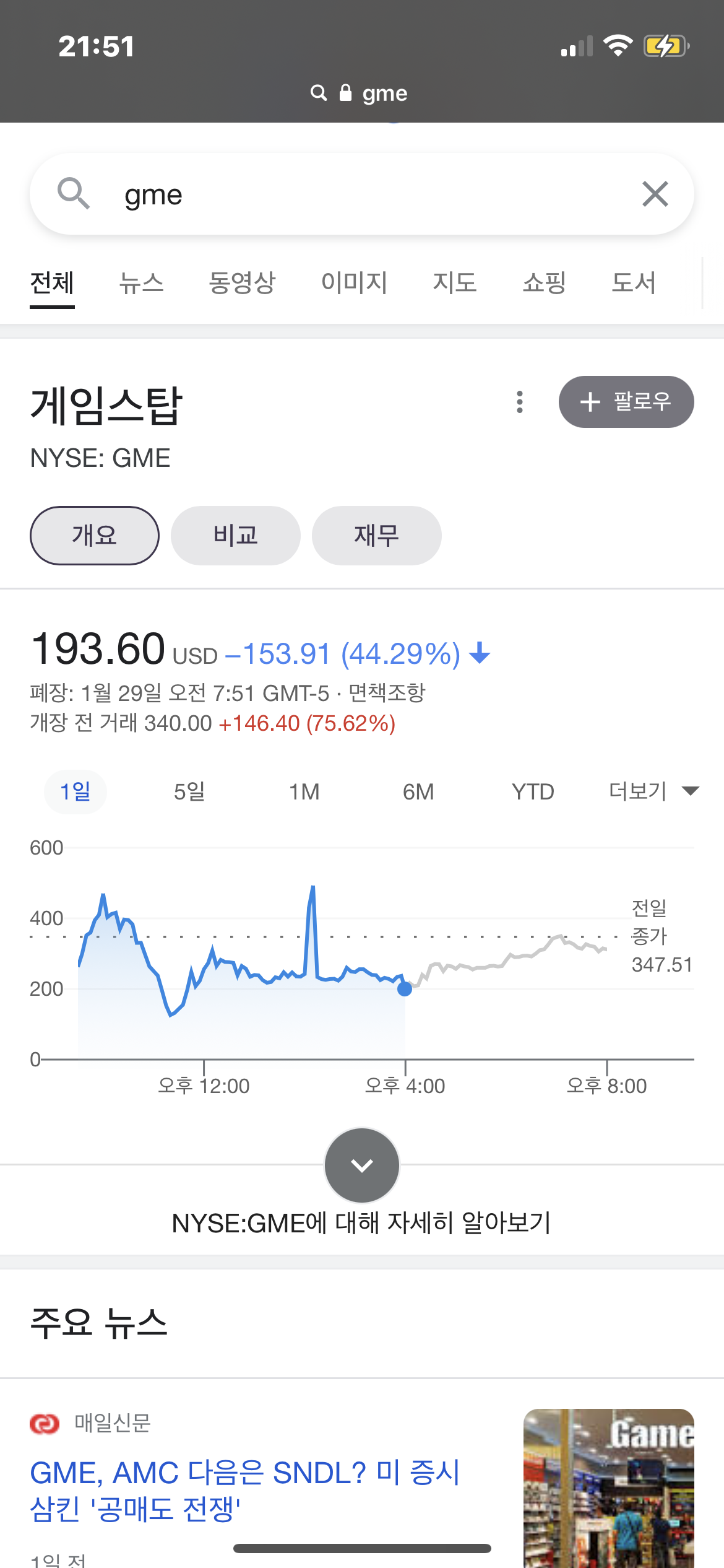 351달러의 게임스탑의 주가는 45분 만에 182달러까지 추락했다가 한 시간 뒤 385달러로 올랐고